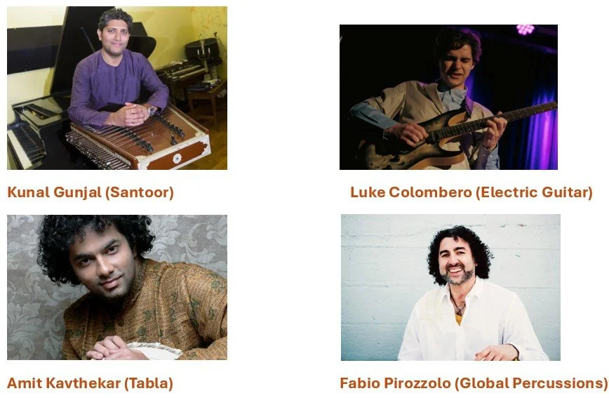 Intrepid Traditions is a global music ensemble that creates a genre-defying eclectic blend of Indian classical and world music, often incorporating instruments from different cultural traditions to further enhance their performances. With an expansive repertoire that spans genres and countries, the ensemble's music reflects the shared beauty of diverse cultures. Their mission is to build cultural bridges, fostering understanding and connection through the universal language of music. Each performance is an exploration of global sounds, bringing listeners on a journey that transcends borders and celebrates unity through artistic expression. The band features: